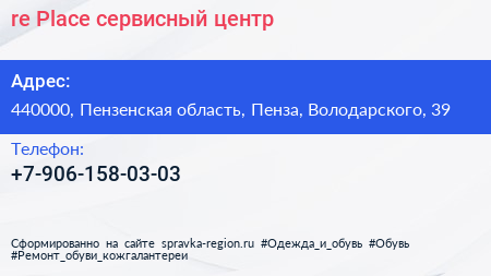 re:Place, сервисный центр по адресу 440000, Пензенская область, Пенза, Володарского, 39 в дальнейшем Организация, размещена в следующих категориях: