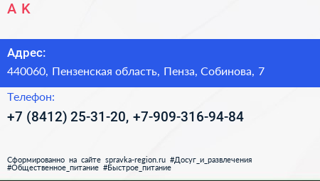A & K по адресу 440060, Пензенская область, Пенза, Собинова, 7 в дальнейшем Организация, размещена в следующих категориях: