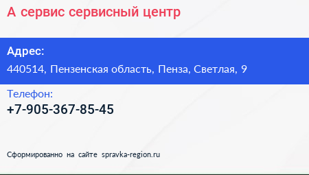 А-сервис, сервисный центр по адресу 440514, Пензенская область, Пенза, Светлая, 9 в дальнейшем Организация, размещена в следующих категориях: