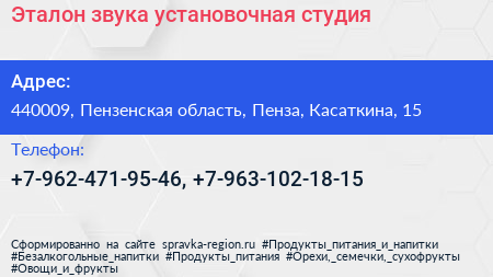 Эталон звука, установочная студия по адресу 440009, Пензенская область, Пенза, Касаткина, 15 в дальнейшем Организация, размещена в следующих категориях: