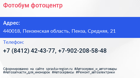 Фотобум, фотоцентр по адресу 440018, Пензенская область, Пенза, Средняя, 21 в дальнейшем Организация, размещена в следующих категориях: