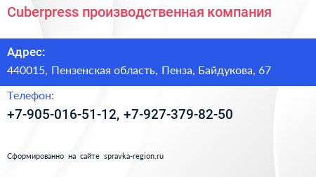 Cuberpress, производственная компания по адресу 440015, Пензенская область, Пенза, Байдукова, 67 в дальнейшем Организация, размещена в следующих категориях: