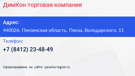 ДимКон, торговая компания по адресу 440026, Пензенская область, Пенза, Володарского, 11 в дальнейшем Организация, размещена в следующих категориях: