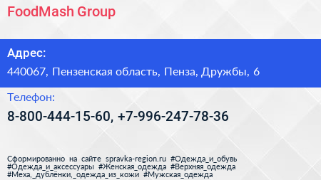 FoodMash Group по адресу 440067, Пензенская область, Пенза, Дружбы, 6 в дальнейшем Организация, размещена в следующих категориях: