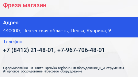Фреза, магазин по адресу 440000, Пензенская область, Пенза, Куприна, 9 в дальнейшем Организация, размещена в следующих категориях: