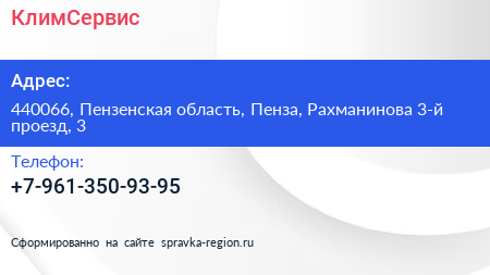 КлимСервис по адресу 440066, Пензенская область, Пенза, Рахманинова 3-й проезд, 3 в дальнейшем Организация, размещена в следующих категориях: