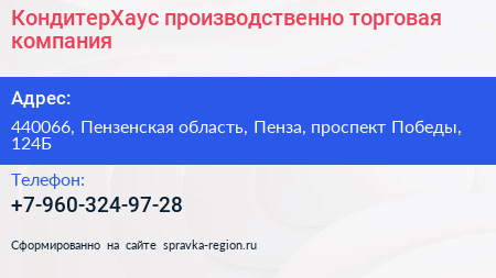 КондитерХаус, производственно-торговая компания по адресу 440066, Пензенская область, Пенза, проспект Победы, 124Б в дальнейшем Организация, размещена в следующих категориях: