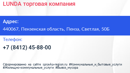 LUNDA, торговая компания по адресу 440067, Пензенская область, Пенза, Светлая, 50Б в дальнейшем Организация, размещена в следующих категориях: