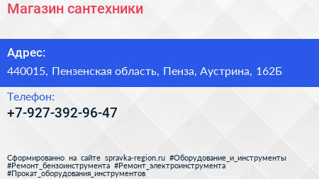 Магазин сантехники по адресу 440015, Пензенская область, Пенза, Аустрина, 162Б в дальнейшем Организация, размещена в следующих категориях: