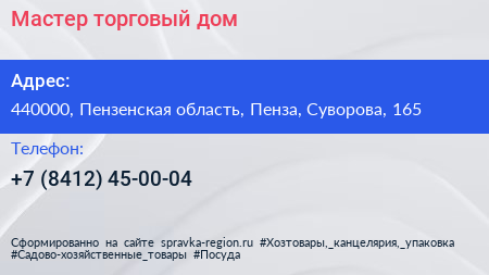 Мастер, торговый дом по адресу 440000, Пензенская область, Пенза, Суворова, 165 в дальнейшем Организация, размещена в следующих категориях:
