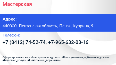 Мастерская по адресу 440000, Пензенская область, Пенза, Куприна, 9 в дальнейшем Организация, размещена в следующих категориях:
