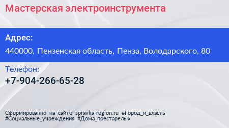 Мастерская электроинструмента по адресу 440000, Пензенская область, Пенза, Володарского, 80 в дальнейшем Организация, размещена в следующих категориях:
