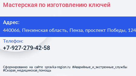 Мастерская по изготовлению ключей по адресу 440066, Пензенская область, Пенза, проспект Победы, 124 в дальнейшем Организация, размещена в следующих категориях: