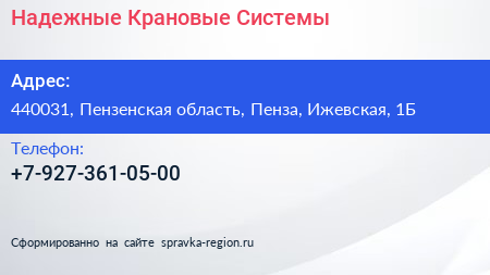 Надежные Крановые Системы по адресу 440031, Пензенская область, Пенза, Ижевская, 1Б в дальнейшем Организация, размещена в следующих категориях: