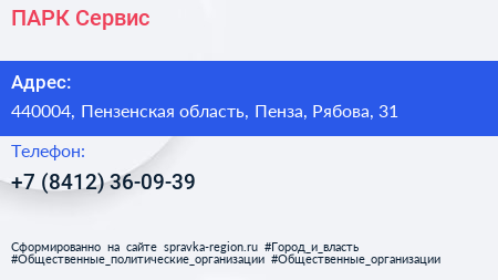 ПАРК-Сервис по адресу 440004, Пензенская область, Пенза, Рябова, 31 в дальнейшем Организация, размещена в следующих категориях: