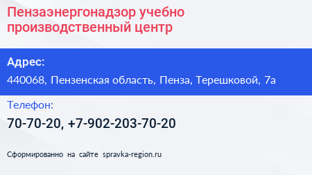 Пензаэнергонадзор, учебно-производственный центр по адресу 440068, Пензенская область, Пенза, Терешковой, 7а в дальнейшем Организация, размещена в следующих категориях: