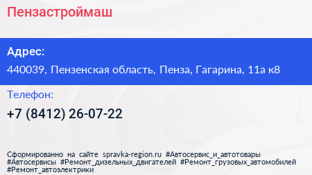 Пензастроймаш по адресу 440039, Пензенская область, Пенза, Гагарина, 11а к8 в дальнейшем Организация, размещена в следующих категориях: