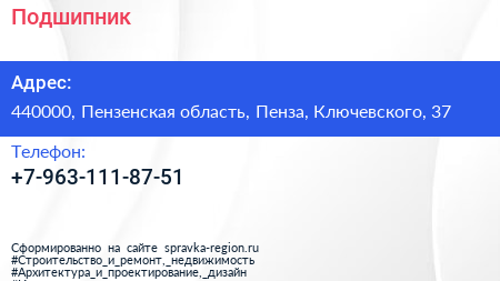 Подшипник по адресу 440000, Пензенская область, Пенза, Ключевского, 37 в дальнейшем Организация, размещена в следующих категориях: