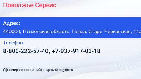 Поволжье Сервис по адресу 440000, Пензенская область, Пенза, Старо-Черкасская, 11а в дальнейшем Организация, размещена в следующих категориях:
