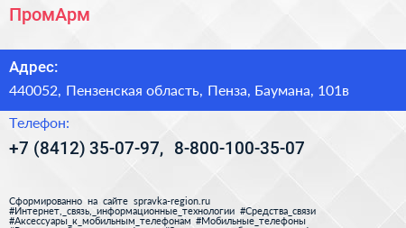 ПромАрм по адресу 440052, Пензенская область, Пенза, Баумана, 101в в дальнейшем Организация, размещена в следующих категориях: