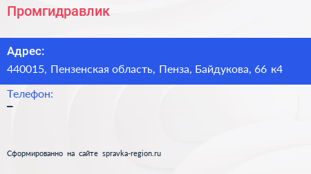 Промгидравлик по адресу 440015, Пензенская область, Пенза, Байдукова, 66 к4 в дальнейшем Организация, размещена в следующих категориях: