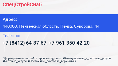 СпецСтройСнаб по адресу 440000, Пензенская область, Пенза, Суворова, 44 в дальнейшем Организация, размещена в следующих категориях:
