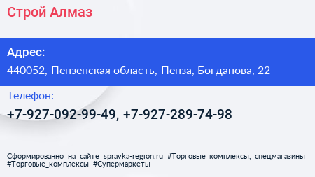Строй Алмаз по адресу 440052, Пензенская область, Пенза, Богданова, 22 в дальнейшем Организация, размещена в следующих категориях: