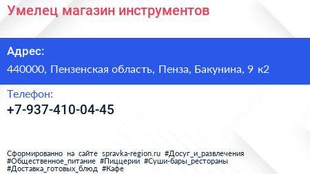 Умелец, магазин инструментов по адресу 440000, Пензенская область, Пенза, Бакунина, 9 к2 в дальнейшем Организация, размещена в следующих категориях: