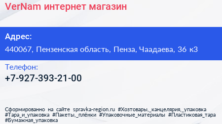 VerNam, интернет-магазин по адресу 440067, Пензенская область, Пенза, Чаадаева, 36 к3 в дальнейшем Организация, размещена в следующих категориях: