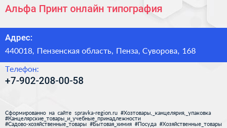 Альфа-Принт, онлайн-типография по адресу 440018, Пензенская область, Пенза, Суворова, 168 в дальнейшем Организация, размещена в следующих категориях: