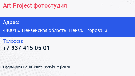 Art & Project, фотостудия по адресу 440015, Пензенская область, Пенза, Егорова, 3 в дальнейшем Организация, размещена в следующих категориях: