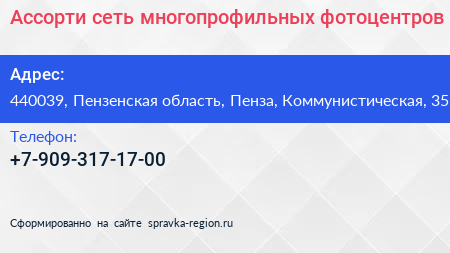 Ассорти, сеть многопрофильных фотоцентров по адресу 440039, Пензенская область, Пенза, Коммунистическая, 35 в дальнейшем Организация, размещена в следующих категориях: