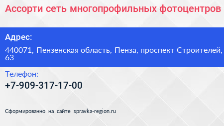 Ассорти, сеть многопрофильных фотоцентров по адресу 440071, Пензенская область, Пенза, проспект Строителей, 63 в дальнейшем Организация, размещена в следующих категориях: