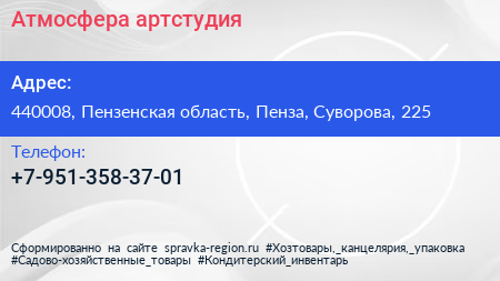 Атмосфера, артстудия по адресу 440008, Пензенская область, Пенза, Суворова, 225 в дальнейшем Организация, размещена в следующих категориях: