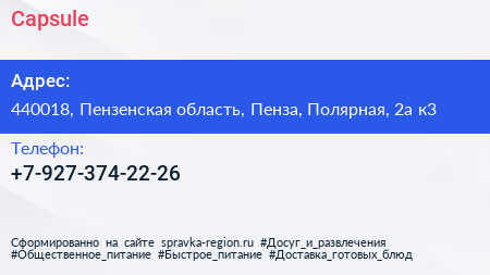 Capsule по адресу 440018, Пензенская область, Пенза, Полярная, 2а к3 в дальнейшем Организация, размещена в следующих категориях: