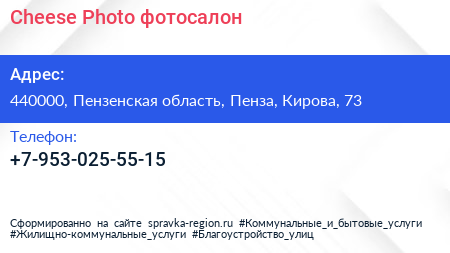 Cheese Photo, фотосалон по адресу 440000, Пензенская область, Пенза, Кирова, 73 в дальнейшем Организация, размещена в следующих категориях: