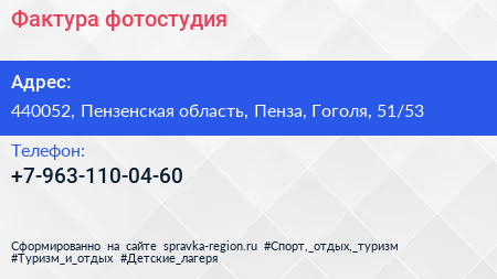 Фактура, фотостудия по адресу 440052, Пензенская область, Пенза, Гоголя, 51/53 в дальнейшем Организация, размещена в следующих категориях: