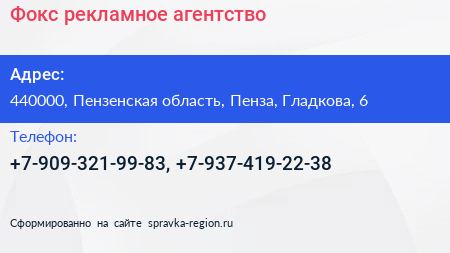 Фокс, рекламное агентство по адресу 440000, Пензенская область, Пенза, Гладкова, 6 в дальнейшем Организация, размещена в следующих категориях: