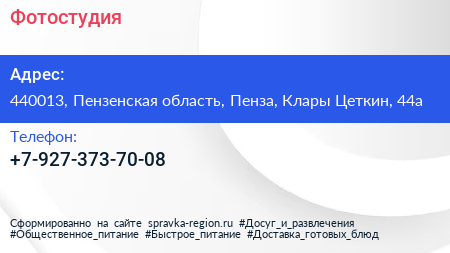 Фотостудия по адресу 440013, Пензенская область, Пенза, Клары Цеткин, 44а в дальнейшем Организация, размещена в следующих категориях: