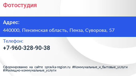 Фотостудия по адресу 440000, Пензенская область, Пенза, Суворова, 57 в дальнейшем Организация, размещена в следующих категориях: