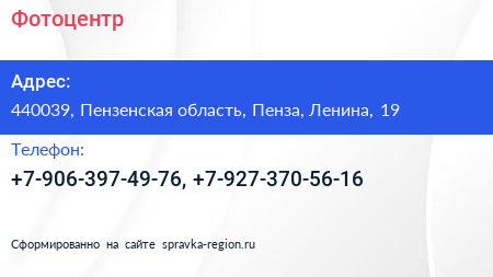 Фотоцентр по адресу 440039, Пензенская область, Пенза, Ленина, 19 в дальнейшем Организация, размещена в следующих категориях: