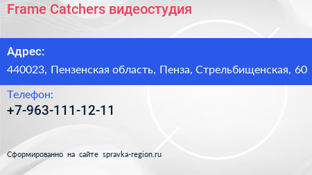 Frame Catchers, видеостудия по адресу 440023, Пензенская область, Пенза, Стрельбищенская, 60 в дальнейшем Организация, размещена в следующих категориях:
