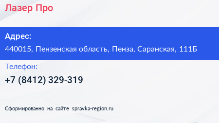 Лазер Про по адресу 440015, Пензенская область, Пенза, Саранская, 111Б в дальнейшем Организация, размещена в следующих категориях: