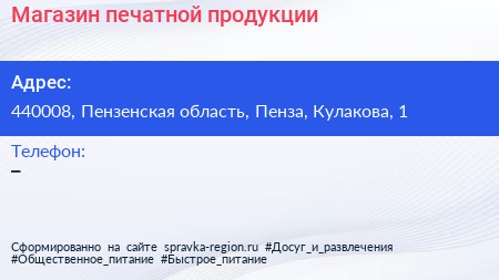 Магазин печатной продукции по адресу 440008, Пензенская область, Пенза, Кулакова, 1 в дальнейшем Организация, размещена в следующих категориях: