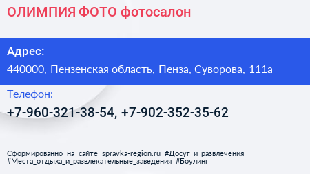 ОЛИМПИЯ ФОТО, фотосалон по адресу 440000, Пензенская область, Пенза, Суворова, 111а в дальнейшем Организация, размещена в следующих категориях: