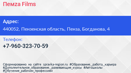 Пемza Films по адресу 440052, Пензенская область, Пенза, Богданова, 4 в дальнейшем Организация, размещена в следующих категориях:
