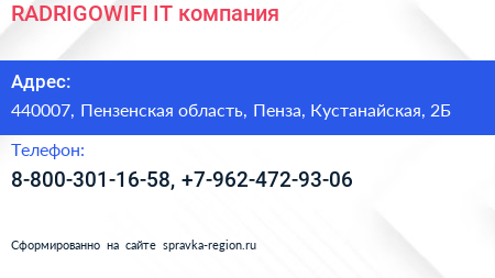 RADRIGOWIFI, IT-компания по адресу 440007, Пензенская область, Пенза, Кустанайская, 2Б в дальнейшем Организация, размещена в следующих категориях: