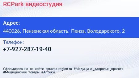 RCPark, видеостудия по адресу 440026, Пензенская область, Пенза, Володарского, 2 в дальнейшем Организация, размещена в следующих категориях:
