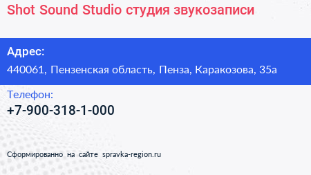 Shot Sound Studio, студия звукозаписи по адресу 440061, Пензенская область, Пенза, Каракозова, 35а в дальнейшем Организация, размещена в следующих категориях: