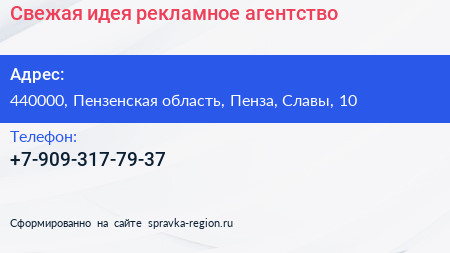 Свежая идея, рекламное агентство по адресу 440000, Пензенская область, Пенза, Славы, 10 в дальнейшем Организация, размещена в следующих категориях: